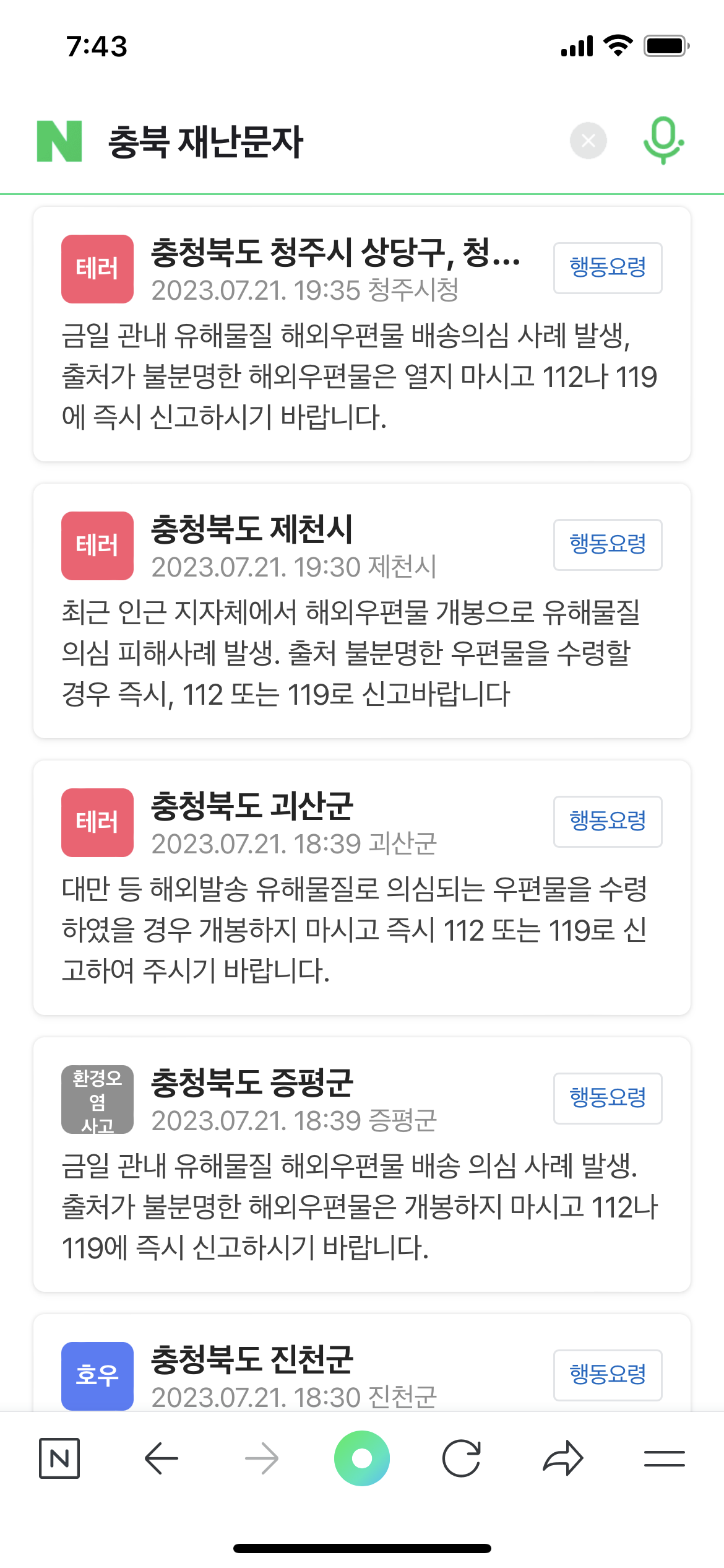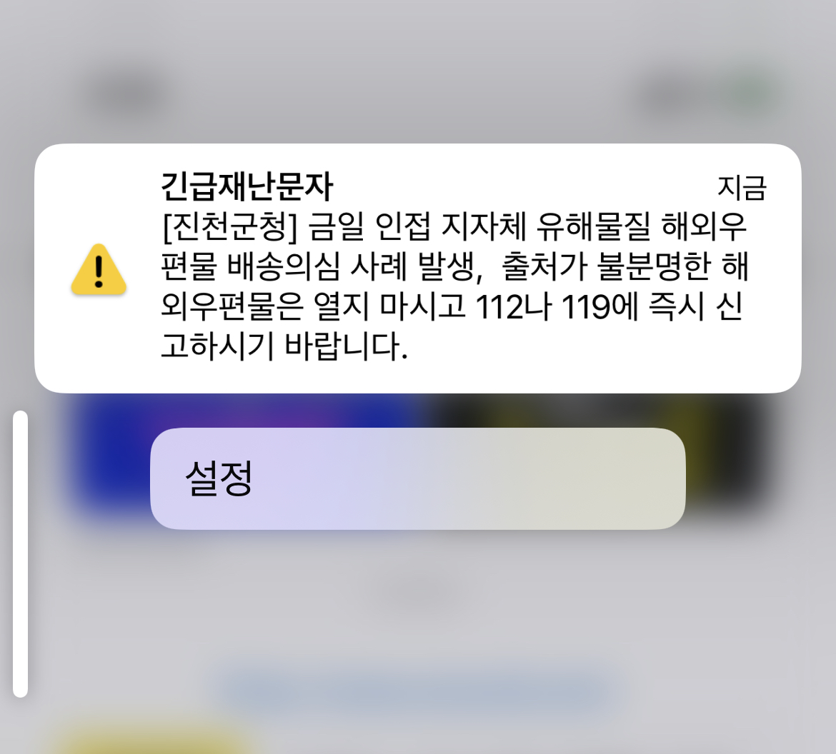 [충북 재난문자] 삐-익 삐-익 유해물질 해외우편물 전국 각지에 배송, 대체 누가 이런짓을..